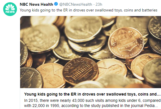 My take: Only 6% of patients in this study who had a coin ingestion had esophageal retention of the coin. In addition, one-fourth of those with esophageal coins had spontaneous passage into the stomach. This occurred only with the mid-distal esophageal coins; in this subset it occurred in 65%. Thus, in those with mid-distal esophageal coins, watchful waiting for ~12 hrs may be beneficial for patients. The ultimate primary prevention of this problem may occur with more widespread adoption of electronic payments.