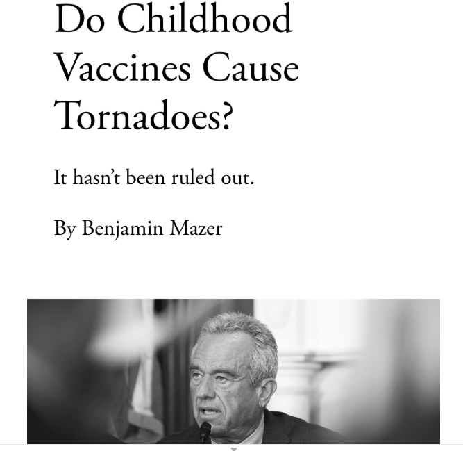 Benjamin Mazer, The Atlantic; 11/21/25: Open Access! Do Childhood Vaccines Cause Tornadoes? It hasn’t been ruled out (Related blog post: CDC Website Changed to Include False Claims About Autism and Vaccines)