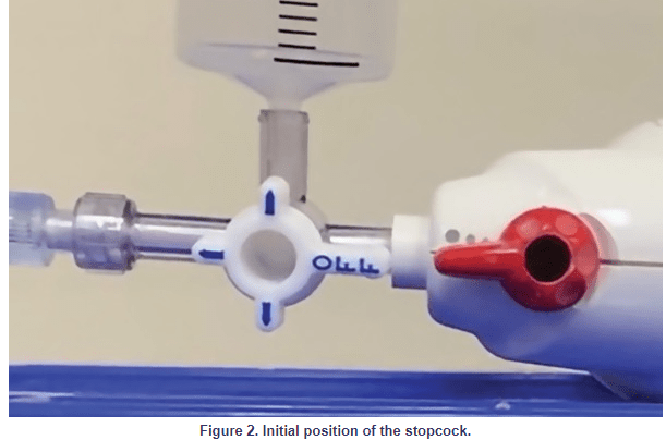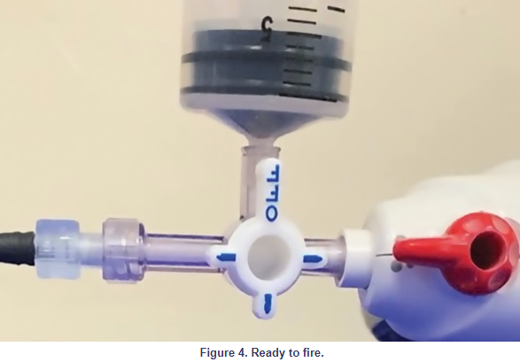 “To set up, a tiny piece of bone wax is shaped into a 1-mm bead and applied to the tip of the 7 or 10 Fr delivery catheter (Figure 1). The catheter is then affixed to the Luer-lock end of a 3-way stopcock. The activated hemostatic powder device and an air-filled syringe are attached to the remaining ends of the stopcock. The stopcock initially is turned to oppose the device (Figure 2)…To fire without drying the working channel or air flushing the catheter, pass the bone wax–tipped catheter down the channel. The catheter tip is protected from moisture, and fluid can be suctioned, especially when using the 7 Fr catheter in a therapeutic gastroscope. When ready to fire, the bone wax plug is ejected with an air flush (Figure 3), the stopcock is turned to oppose the syringe (Figure 4), and the hemostatic powder is deployed.”
