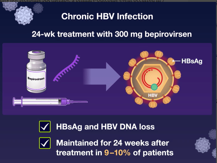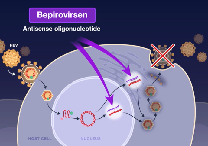 Mechanism of Action: Bepirovirsen is an antisense oligonucleotide that targets all hepatitis B virus (HBV) messenger RNAs and acts to decrease levels of viral proteins.