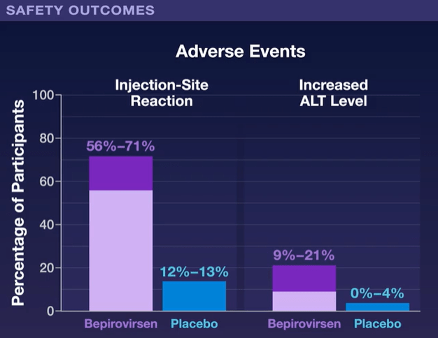 In this phase 2b, randomized, investigator-unblinded trial involving 457 participants with chronic HBV infection (1/2 receiving nucleotide analogue (NA) therapy), the authors evaluated bepirovirsen is an antisense oligonucleotide that targets all hepatitis B virus (HBV) messenger RNAs and acts to decrease levels of viral proteins.