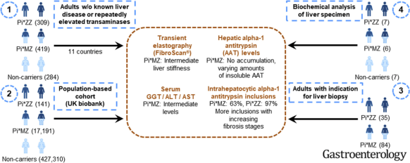 Alpha-one antitrypsin heterozygositiy contributes to cirrhosis in fatty liver disease. Liver Transplantation 2020; 26: 17-24. From the discussion: “unexpected PASD+ globules, in the context of advanced liver disease, are a specific finding that indicates the presence of a mutant A1AT allele.” Of 196 explanted livers from NASH patients, 21 (11%) has PASD+ globules; however, among NASH patients the frequency was 47%. Also, the Z allele was present in 10% of all tested liver explants, this exceeds the 2% rate in the general population. Thus, in agreement with other studies, A1AT heterozygosity contributes to chronic liver failure, but may affect fatty liver disease more than other chronic liver diseases.