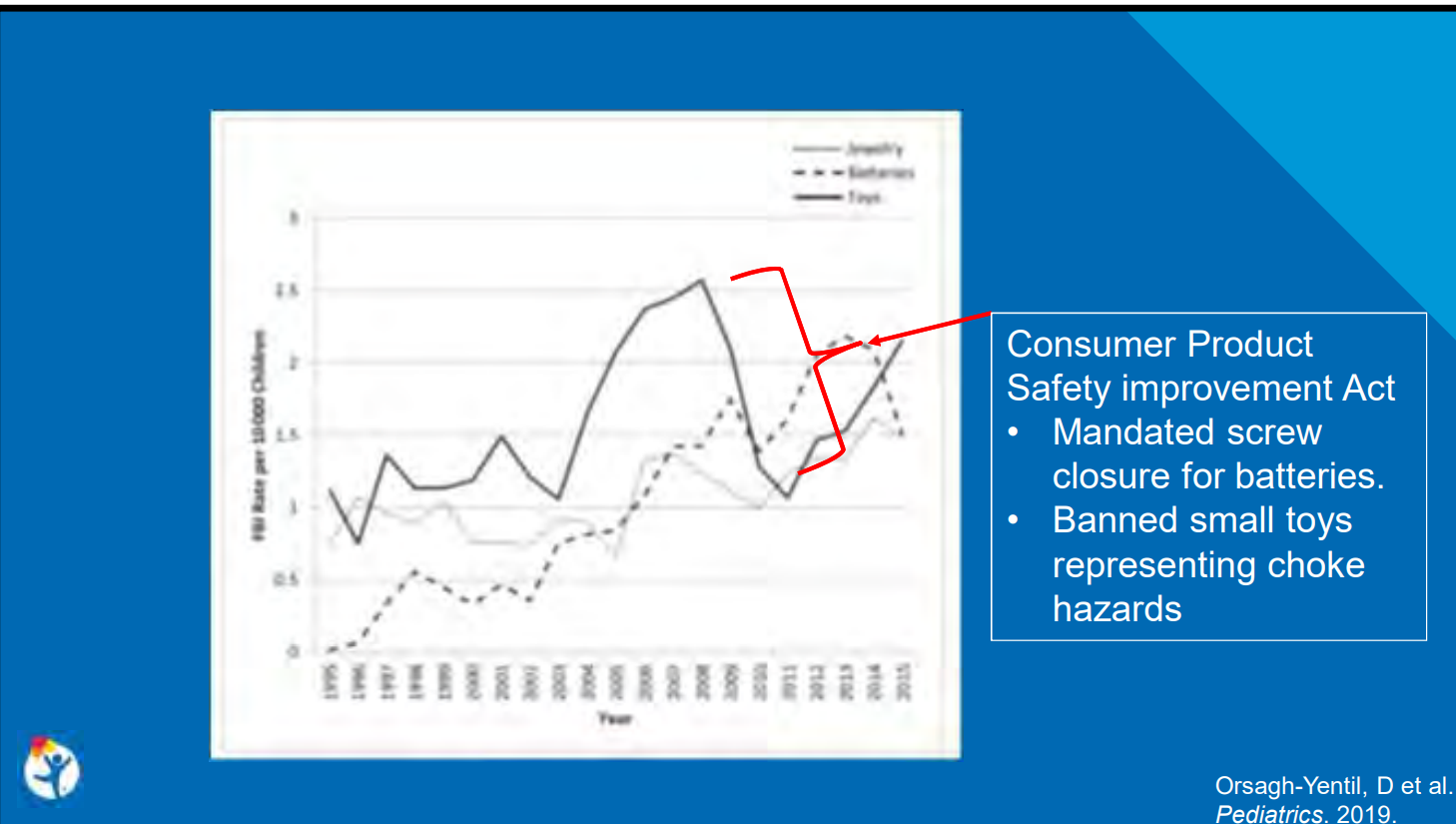 “More than 3,000 cases occur per year, mostly among children younger than age 6, and severe cases are on the rise. Lodged button batteries can cause rapid injury, including permanent bilateral vocal cord paralysis and even death.”