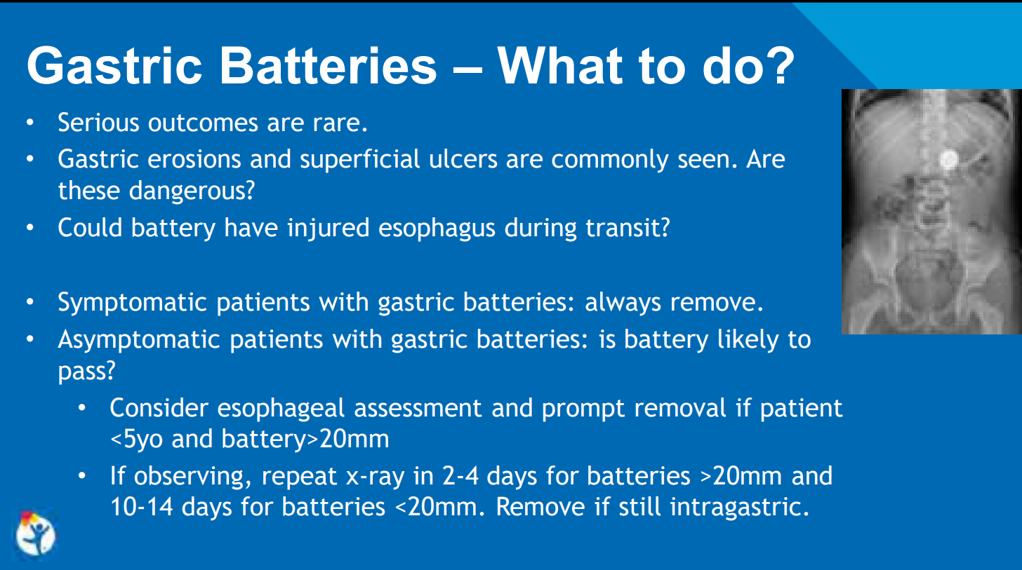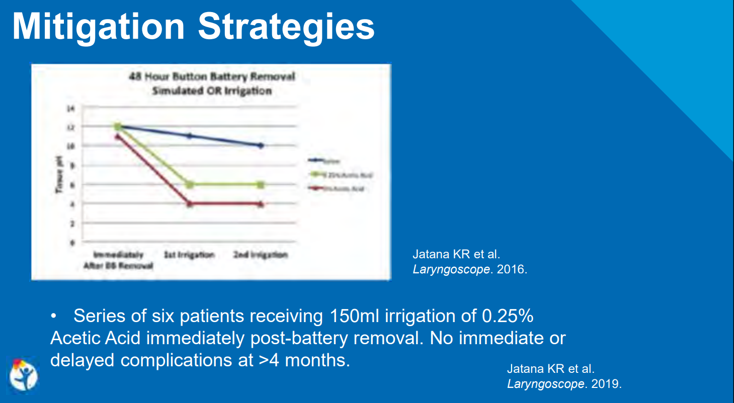 1. At time of endoscopy,  “a weak acetic acid rinse (sterile vinegar) can help neutralize tissue pH and protect the esophagus from continued tissue breakdown after battery removal. This irrigation concept has now been successfully used in children around the world with good clinical outcomes.”