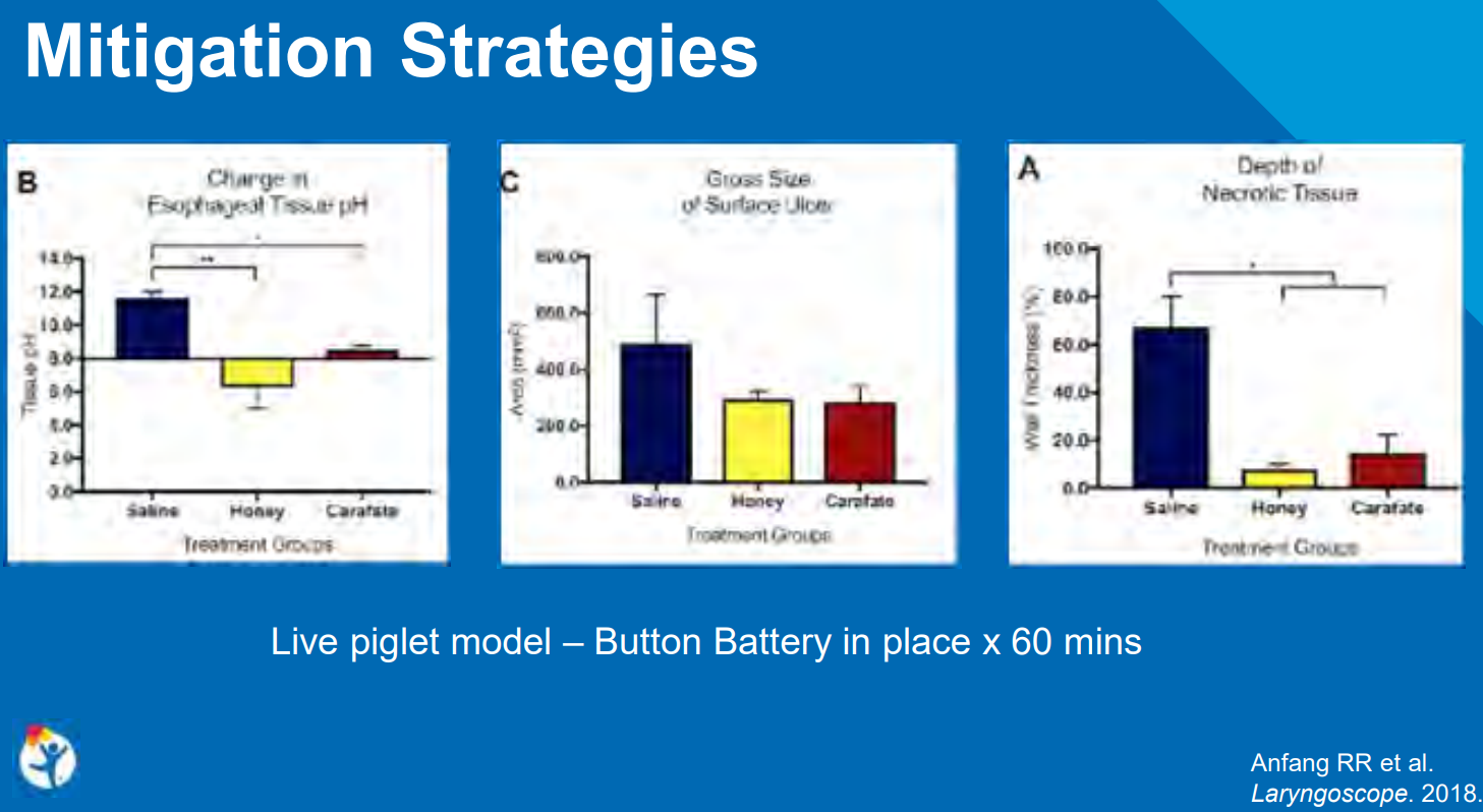 Honey is administered to coat the battery and prevent local generation of hydroxide, thereby delaying alkaline burns to adjacent tissue. Efficacy is based on a 2018 study (Anfang et al) assessing the in vitro protective effects of various liquids in the cadaveric porcine esophagus and in vivoprotective effects of honey and sucralfate (Carafate®) compared to saline irrigations of batteries placed in the esophagus of live piglets. Both honey and sucralfate (Carafate®) effectively prevented the expected battery-induced pH increase and decreased the depth of the resulting esophageal injury.
