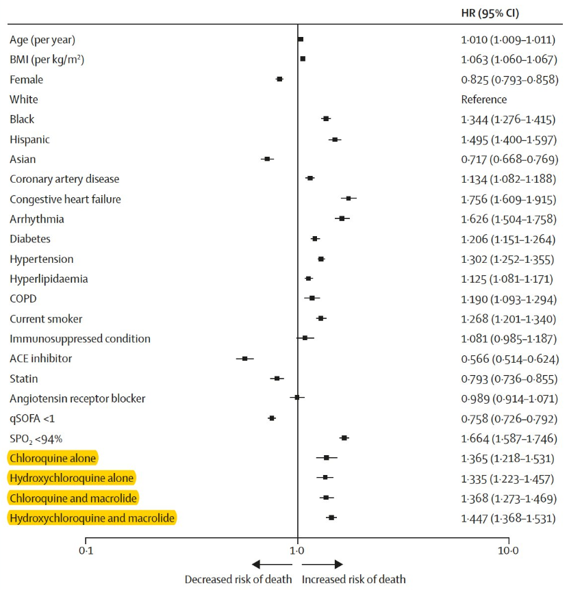 From @EricTopol: Just published @TheLancet The largest study of hydroxychloroquine shows a significant increase in death (~35%) and >2-fold increase of serious heart arrhythmias. ~96,000 patients, ~15,000 on HCQ or CQ from 671 hospitals, 6 continents.