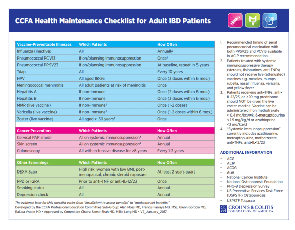 FF It is helpful for providers to keep a copy of the Crohn’s and Colitis Foundation’s health maintenance recommendations posted in their office. This 1-page checklist (available at http://www.crohnscolitisfoundation.org/science-and-professionals/programs-materials/ccfa-health-maintenance.pdf) includes all recommended vaccines and also comments on other important health maintenance items, such as screening for cervical and skin cancer, depression, and osteoporosis. In addition, Cornerstones Health has a vaccination checklist (available at http://www.cornerstoneshealth.org/wp-content/uploads/2017/06/Monitoring-and-Prevention-3.10.2017.pdf) that can be downloaded, printed, and placed in each examination room to reinforce the importance of vaccination. Primary care providers as well as gastroenterologists can use these checklists as reminders in their busy practices.
