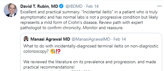 My take: As noted below by Dr. Rubin, in those with normal labs who are asymptomatic, most incidental ileitis is not progressive and should be monitored.