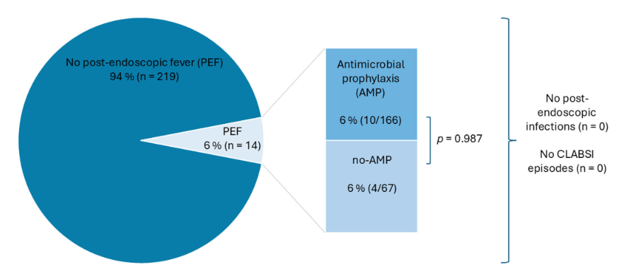 - The overall post-endoscopic fever (PEF) rate was 6%, with no significant difference between the group that received prophylactic antibiotics and the group that did not. Specifically, there were 10 with PEF that had received prophylactic antibiotics and 4 that had PEF with no prophylaxis