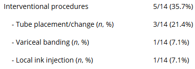 - 5/14 of the cases with PEF had an interventional procedure. The remainder had a diagnostic EGD, colonoscopy or both.