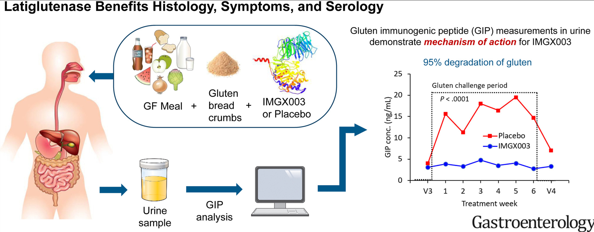 - Measurements of gluten-immunogenic peptides (GIP) in urine indicated 95% gluten degradation in the stomach by latiglutenase.