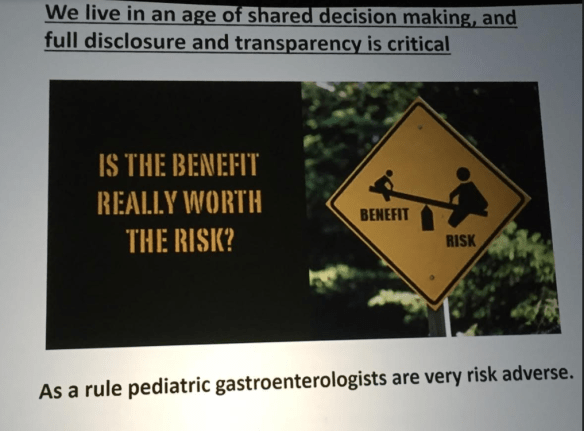 A recent study (NE Newman, KL Williams, BJ Zikmunde-Fisher, J Adler. JPGN 2020;70: e33-36) highlights work to communicate the benefits and risks of the treatment for inflammatory bowel disease (IBD) along with the risks of untreated IBD. “We developed a simple video aid to illustrate competing risks associated with medications and underling disease in context of inflammatory bowel disease…Those who viewed the video aid had more realistic perceptions than those who did not view it.”