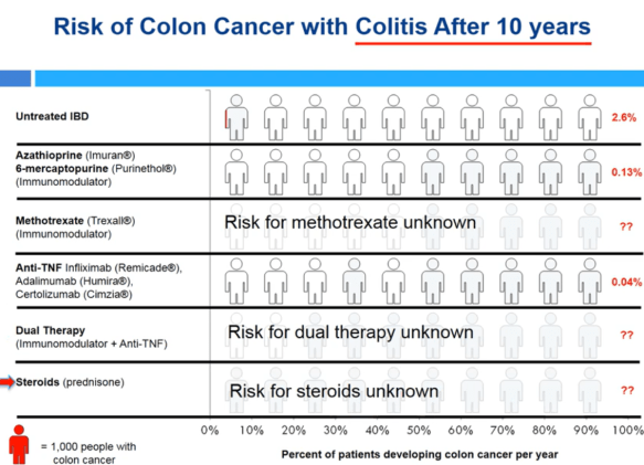 I think this summary slide could be improved by noting that the overall risk of serious cancers is likely lowered by treating IBD. Since colon cancer is a fairly common cancer and IBD treatment reduces the risk, this likely outweighs the increased risk of other cancers (eg. lymphoma) which are much less common.