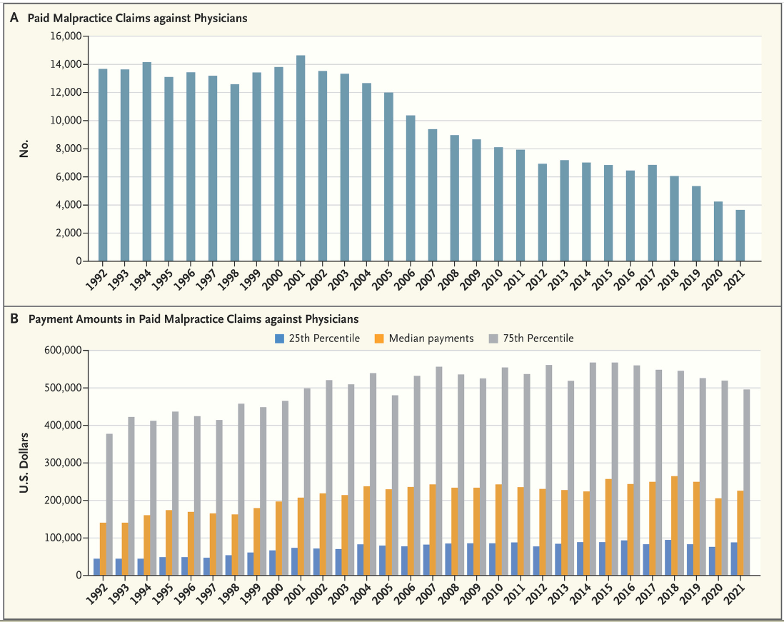 • “NPDB data reveal a remarkable phenomenon: the number of paid claims against physicians has decreased by 75% in the past 20 years.” The potential reasons include tort reform, greater openness about medical errors may have reduced patients’ inclination to sue, better medical care (no evidence of this), and incomplete NPDB data. With regard to incomplete data, this can occur with “corporate shielding” in which institutions assume liability and payment responsibility in claims against physicians, thus averting reporting requirements).