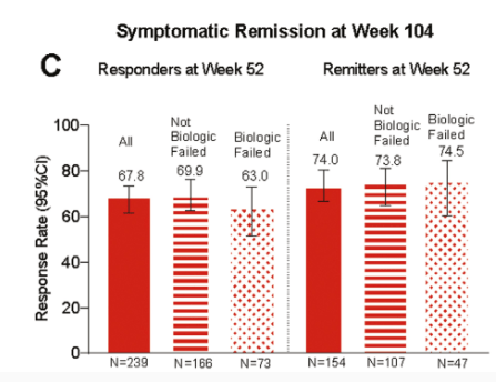 In this LUCENT-3 study, the authors examined response at 2 years among patientswho had response to treatment at 1 year; patients received 200 mg mirikizumab every 4 weeks. The authors stratified patients by induction response and by previous biologic exposure.