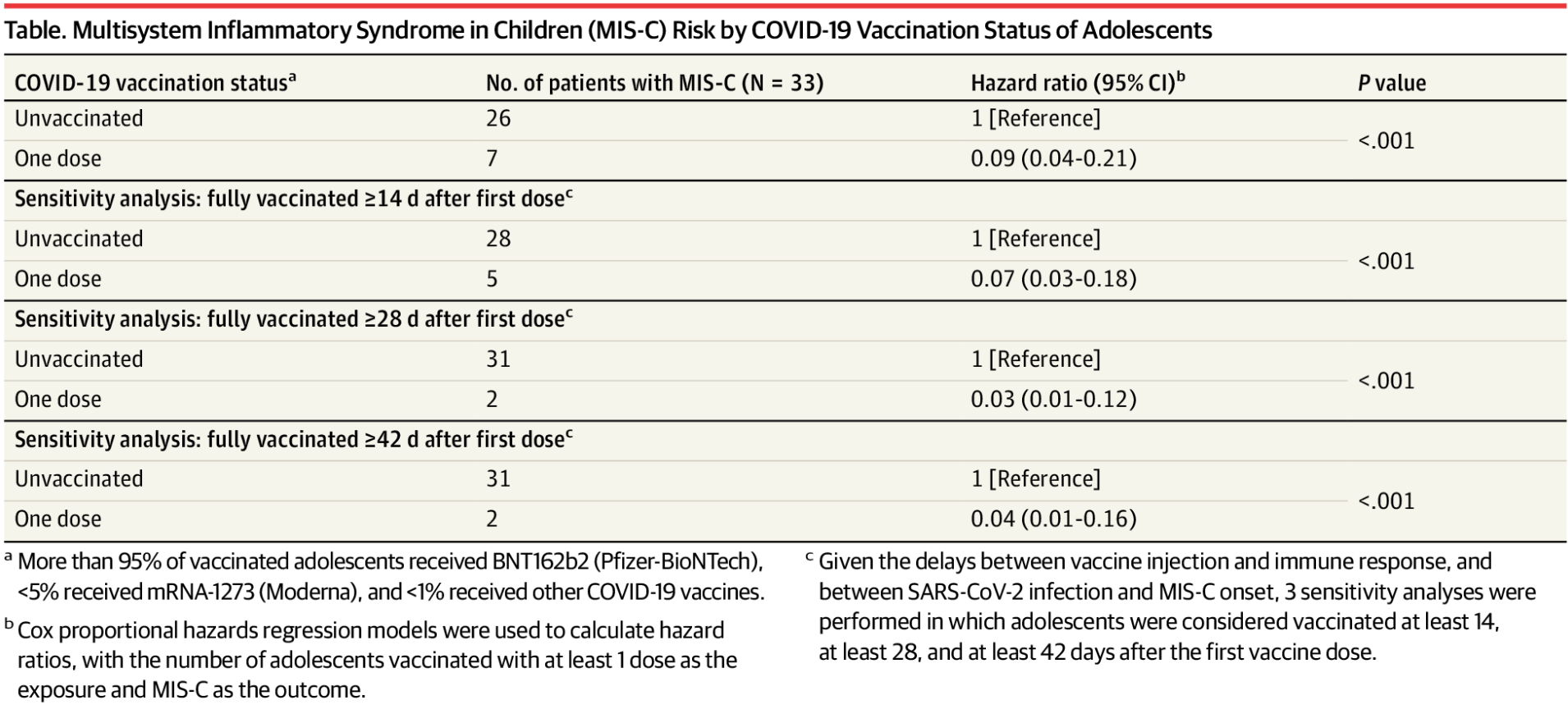 My take: This study indicates that COCID-19 vaccination likely results in a marked decrease in the risk of MISC-C. This finding provides an additional reason favoring vaccination in adolescents in terms of risk-benefit calculation for immunization.