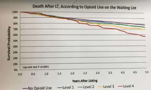 Not surprisingly, a recent study (HB Randall et al. Liver Transplantation 2017; 23: 305-14) has found that use of opioid medications prior to liver transplantation (LT) increased mortality over 5 years after transplantation.