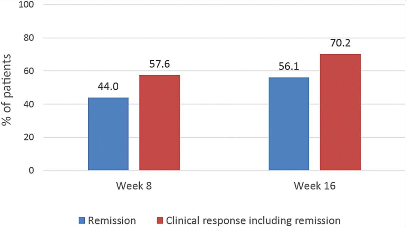 - Fistulizing disease (primarily perianal) treated with upadacitinib achieved higher rates of resolution of drainage, closure of external openings, clinical remission, and endoscopic response vs placebo