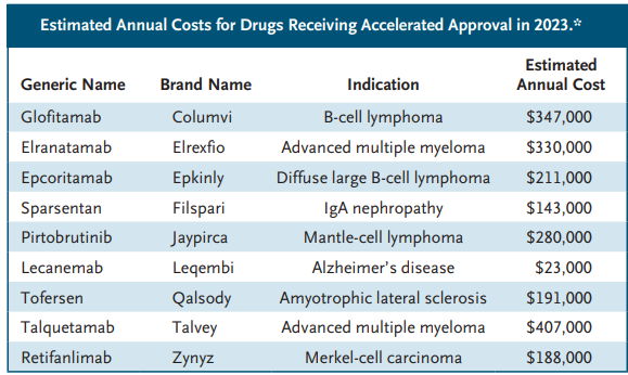 In 2023, the median list price of new drugs was $300,000 per year. The FDA does not consider drug cost as part of its approval process.