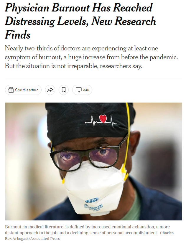 A survey published last fall in Mayo Clinic Proceedings showed an alarming increase in physician burnout, with 62.8% of respondents reporting at least one symptom in 2021 compared to just 38.2% in 2020.