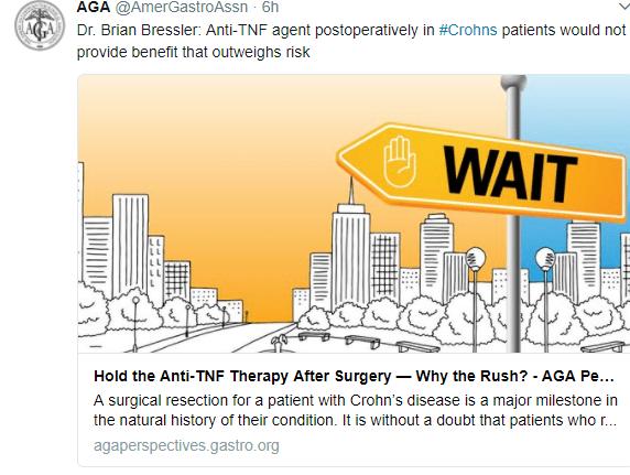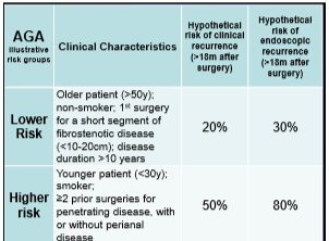 - In those at high risk for postoperative disease recurrence, the authors advocate anti-TNF therapy plus an immunomodulator with colonoscopy at 6-12 months. In those at low risk, many are placed on no medications and have a colonoscopy at 6 months postoperatively.