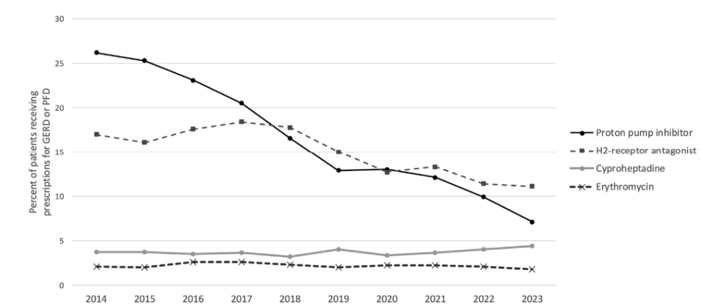 - The percent of patients receiving any prescription for GERD or PFD declined by almost 50%, from 36.5% in 2014 to 18.7% in 2023 (P < .001)