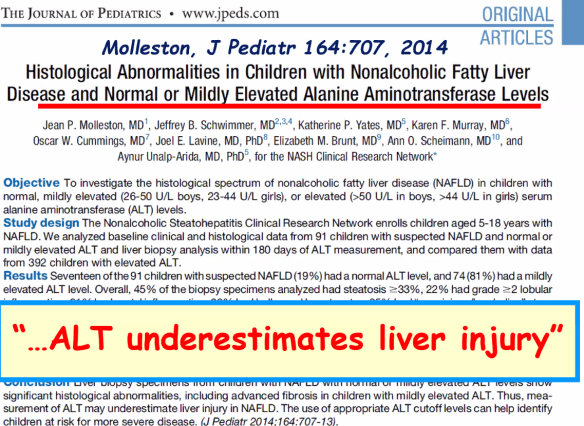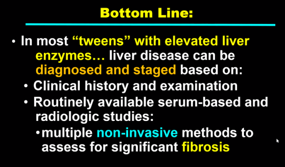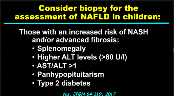 - Discussed role/indications of liver biopsy. Liver biopsy is NOT practical option for all children with fatty liver disease and elevated liver enzymes