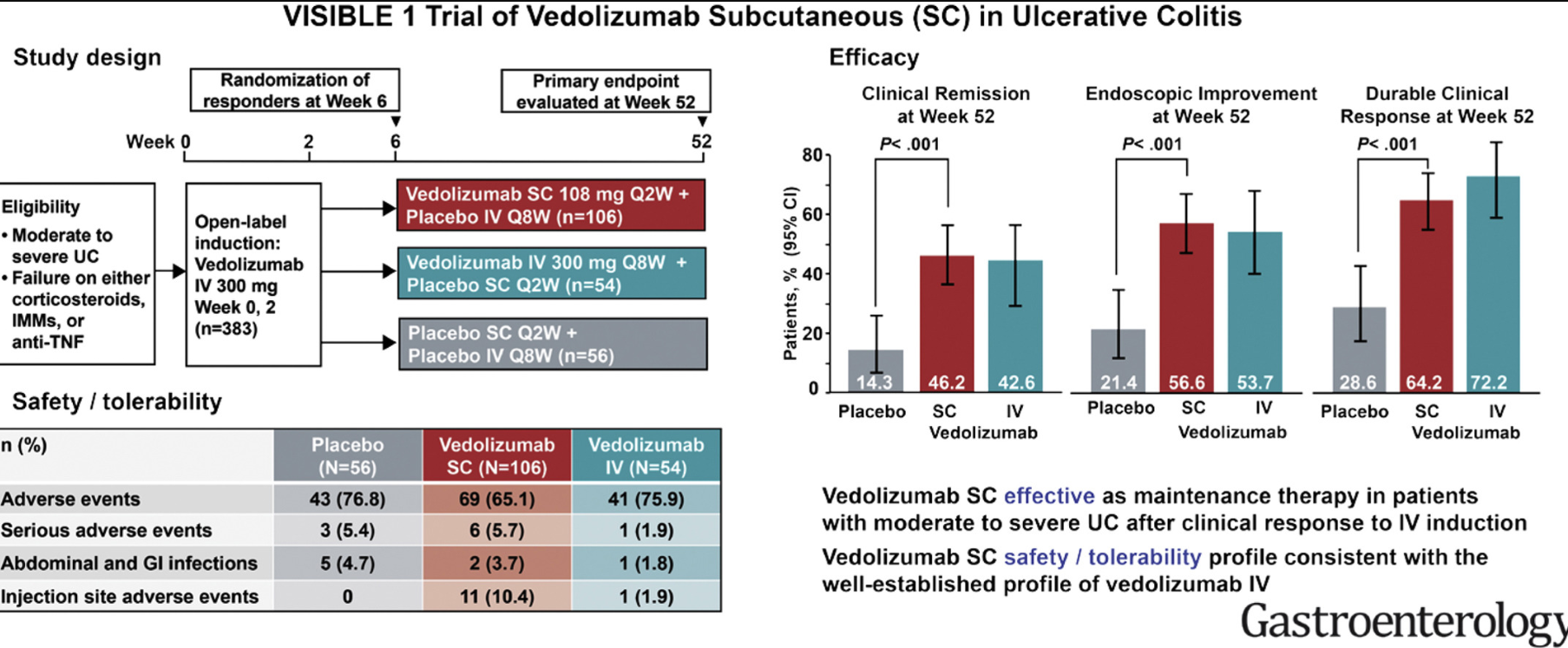 My take: This study indicates that SC infliximab (like IV infliximab) appears to be more effective than vedolizumab for patients with Crohn’s disease and similarly effective for ulcerative colitis, keeping in mind the aforementioned discussion points. While not evident in this study, vedolizumab has a superior safety profile.