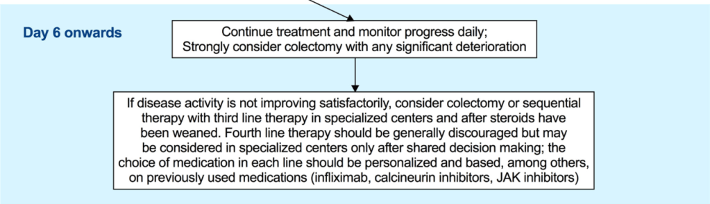 My take: Continuing steroids when they are not effective prior to potential surgery (eg. ASUC) remains a frequent problem. Sometimes, it is difficult to know it they are helping some.